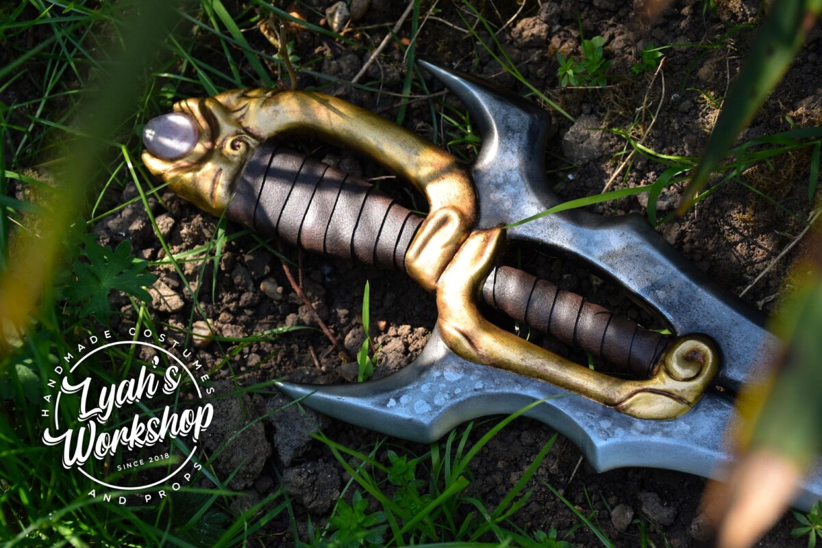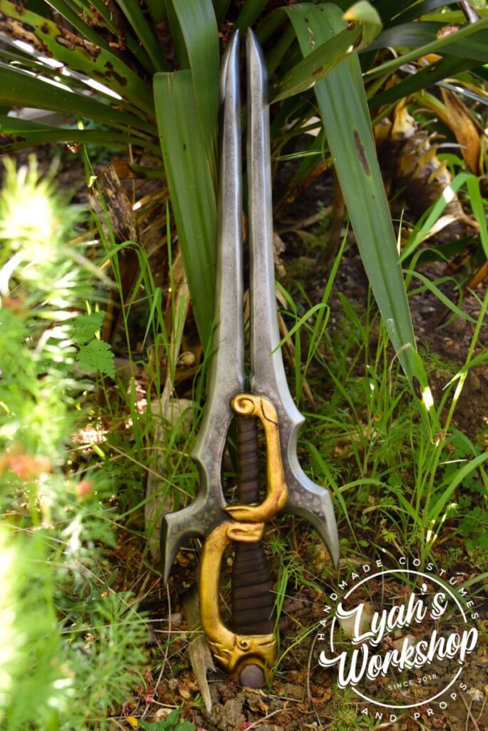 En regardant la série Dark Crystal : Le temps de la résistance sur Netflix, j’ai beaucoup aimé le design du Double Glaive; une arme légendaire constituée de deux épées qui s’assemblent pour n’en former qu’une.