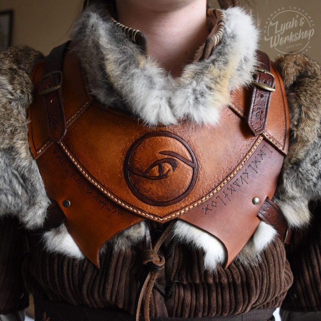 La dernière pièce qui a été ajoutée, est un gorgerin en cuir. L’idée était de reproduire les uniformes des officiers au parc RustiK, mais en ajoutant des runes propres à mon personnage. « Vaincre avec courage plutôt que par la force ».